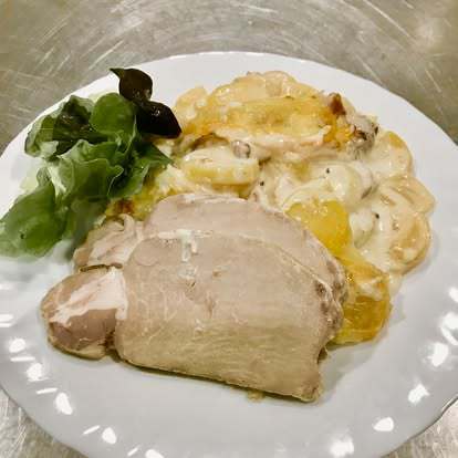 Pomme de terre rondelles cuisinées à la crème avec oignons et lardons